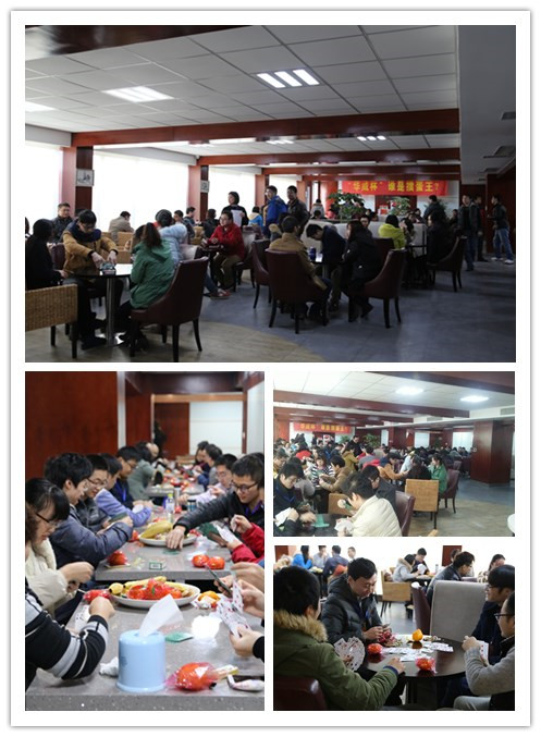 為迎接2016年新春,豐富員工業余文化生活,提高職工團隊協作意識,促進職工之間的相互交流,公司特舉辦“華威杯”迎新年摜蛋大賽。比賽由員工自由組合和配對,共48對選手參與了比賽。本著友誼第一,比賽第二的精神,比賽現場既有緊張的比賽氛圍,也充滿了歡聲笑語。經過40余場的激烈角逐,來自合成三部的賈凱、寧朋獲得了第一名,來自合成六部的沈東、于智宇獲得了第二名,來自合成三部的趙冬冬、程奇獲得第三名。