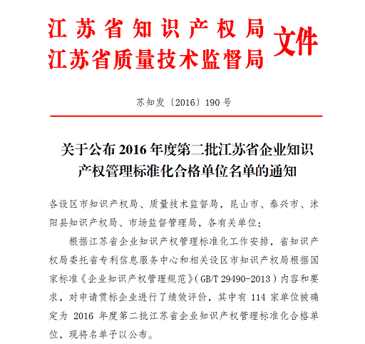 近日,接到蘇知發〔2016〕190號通知,華威醫藥順利通過知識產權管理體系“貫標”審核,成功獲批江蘇省知識產權“貫標”合格單位,使得公司知識產權的風險防范與自我保護多了一重保障,也進一步地給廣大客戶的權益增添了一重保障。