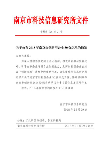“陽光燦爛臘月天,喜訊傳來笑開顏”。近日,南京華威醫藥科技集團有限公司收到南京市科委所屬科技信息研究所《關于公布2018年南京市創新型企業50強名單的通知》寧科信〔2018〕21號文件,華威醫藥榮耀入選2018年南京市創新型企業50強。