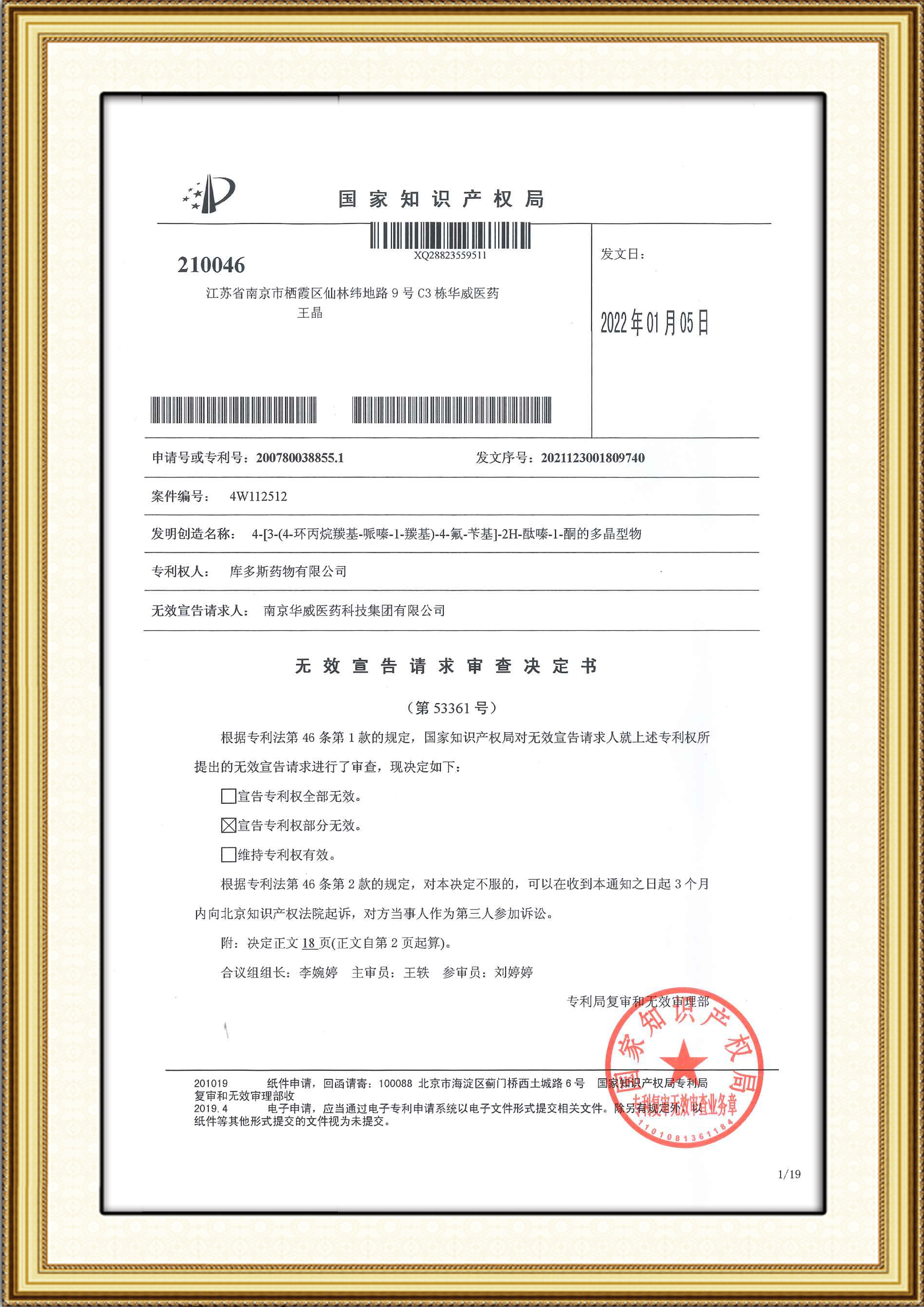 華威知識產(chǎn)權(quán)部經(jīng)過對涉案專利細(xì)致的梳理,檢索了大量的文獻(xiàn)和進(jìn)行深入的分析后,提交了九份證據(jù)文件,同時結(jié)合公知常識,證明該專利不具有新穎性和創(chuàng)造性,最終合議庭經(jīng)過認(rèn)真的審查認(rèn)同了我方的主要觀點(diǎn),宣告專利權(quán)部分無效。僅保留了權(quán)利要求2(A晶的諸多制備方法中的一種)有效,該保護(hù)范圍實(shí)質(zhì)上不會對我司生產(chǎn)A晶產(chǎn)生任何障礙,實(shí)現(xiàn)了我司本次專利無效的主要目的。