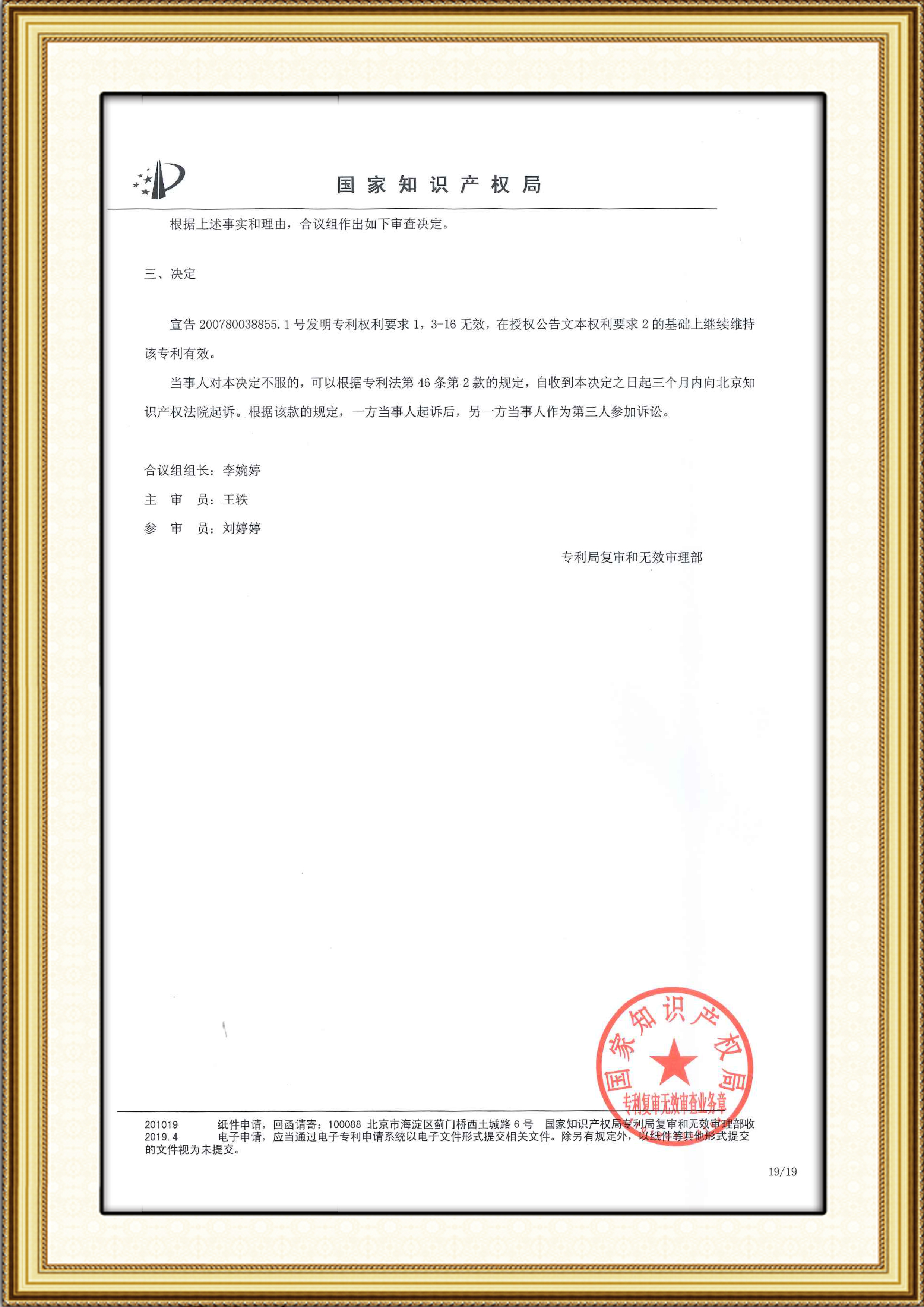 近日,我司收到國家知識產(chǎn)權(quán)局復(fù)審與無效審理部針對專利200780038855.1的無效宣告案件作出第53361號無效決定,宣告專利權(quán)部分無效(權(quán)1、3-16無效,權(quán)2維持有效)。因?yàn)樵趦H“權(quán)利要求2維持有效”的基礎(chǔ)上,請求人制備的產(chǎn)品將不會落入該保護(hù)范圍內(nèi),達(dá)到了本次專利無效挑戰(zhàn)的目的。
