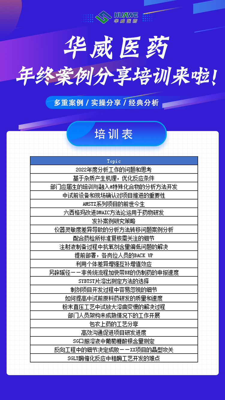 “基于雜質產生機理,優化反應條件”、“反向工程中的細節決定成敗——XX項目的晶型攻關”、“儀器靈敏度差異導致的分析方法轉移問題案例分析”、“發補案例研究策略”、“包衣上藥的含量及均勻度控制技巧”、“高效溝通促進項目研發進度”、“部門應屆生的培訓與融入”...為期兩天的培訓里,華威醫藥研發體系各部門經理從專業技術角度、管理角度出發,結合實際案例,與大家共同總結分享。誠意滿滿的年度盤點、高強度的案例“充電”,讓人直呼華威醫藥最卷“敬業?!鄙暇€!
